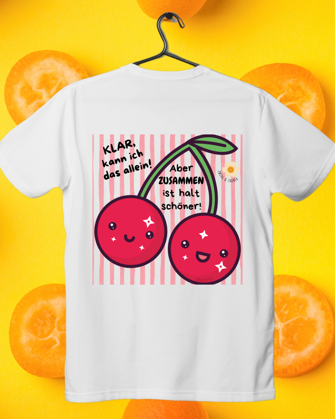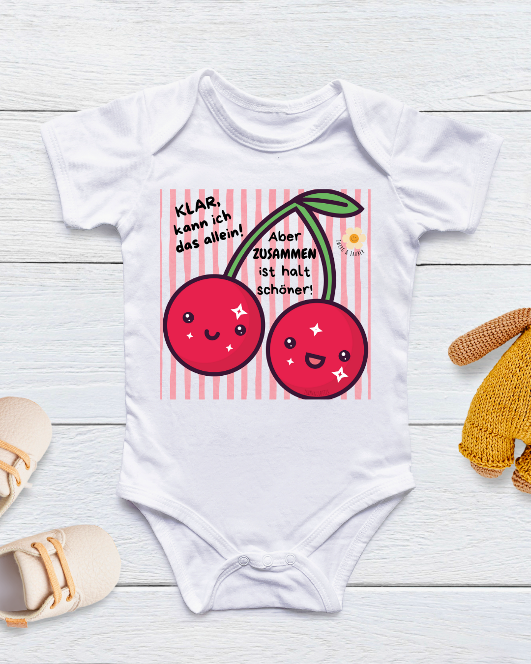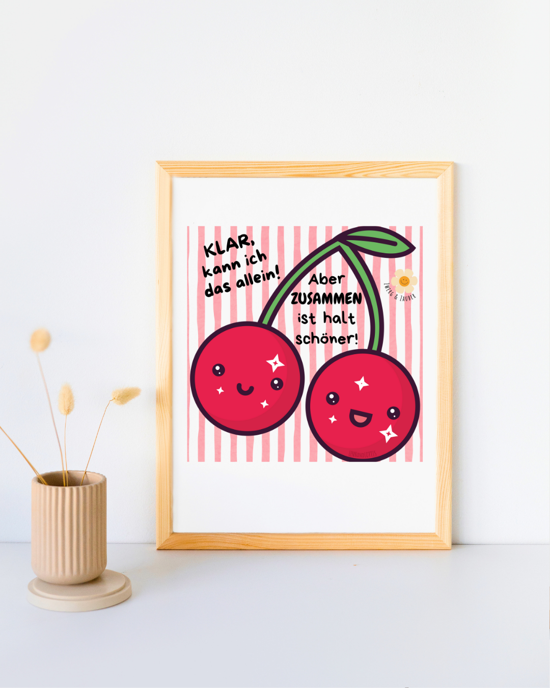 Dieses zuckersüße Motiv zeigt zwei lachende, aneinanderhängende Kirschen – ein Symbol für Verbundenheit und die Schönheit des Miteinanders. Es ist eine herzerwärmende Erinnerung daran, dass Kinder oft schon eine Menge alleine können, aber die gemeinsame Zeit und liebevolle Unterstützung unbezahlbar sind. Das Motiv passt perfekt ins Kinderzimmer, in den Spielbereich, die Familienecke oder wo immer du eine Botschaft der Zusammengehörigkeit und gegenseitigen Wertschätzung schaffen möchtest. Ein charmanter Blickfang, der spielerisch daran erinnert: Manche Dinge gehen allein, aber zusammen ist es einfach schöner!